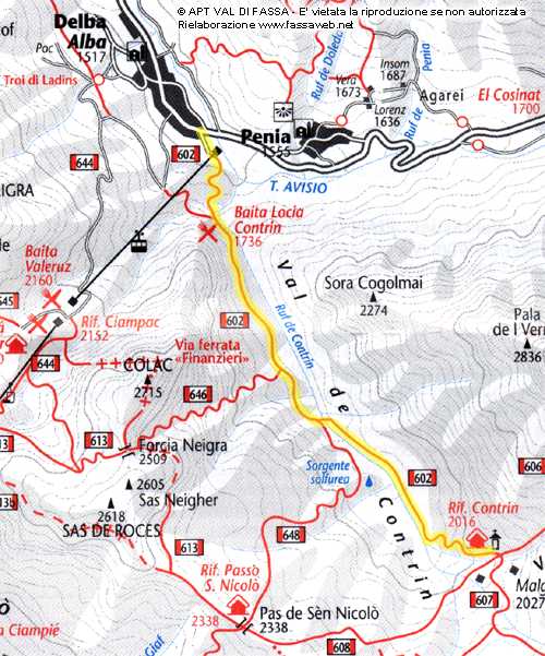 A Dèlba (m 1.517) nei pressi della funivia inizia la mulattiera sentiero n. 602, che con fitta serpentina nel bosco porta a superare il ripido dislivello iniziale della valle uscendo presso la baita Locia Contrin (m 1.736). Il sentiero si fa pianeggiante. Si attraversa una zona di rado bosco per entrare negli spaziosi pascoli della valle. Si cammina in uno scenario grandioso di cime che circondano la valle su ogni lato. A destra il Colac, a sinistra il Vernel e la Marmolada, mentre verso est si erge il monumentale torrione della Cima di Ombreta. Si attraversa il ruf de Contrin, si va in diagonale verso il rifugio omonimo (m 2.016) che domina da un dosso e lo si raggiunge con alcuni comodi tornanti disegnati in un bosco di radi larici (ore 1.30).
